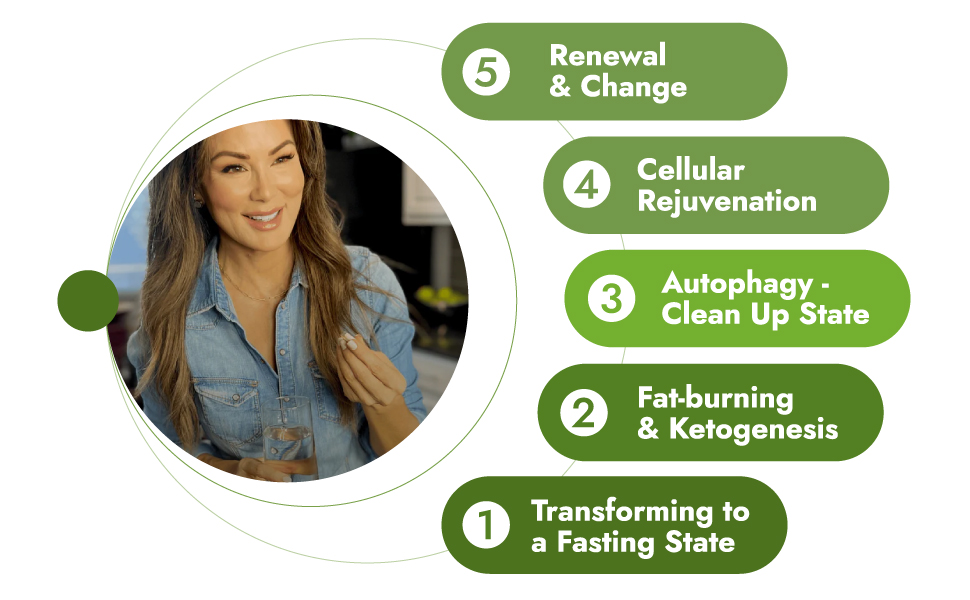 Day 5: Deep renewal and change Your body has undergone a significant transformation: Autophagy recycled and removed old cells to replace them with younger, high-functioning components. These cells now function as younger versions of themselves, supporting lasting benefits. On Day 5, you may wake up feeling sharper, recharged, and lighter, with a renewed sense of energy and a change on the scale—a testament to all the amazing work your body has done.